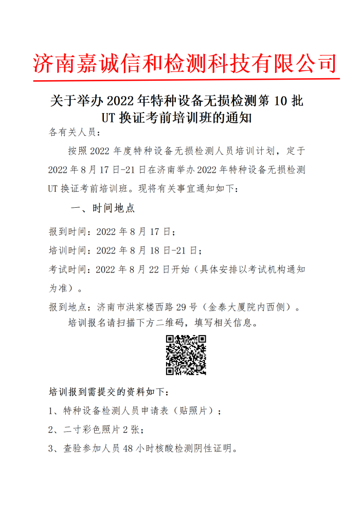 2022年特种设备无损检测第10批UT换证考前培训通知
